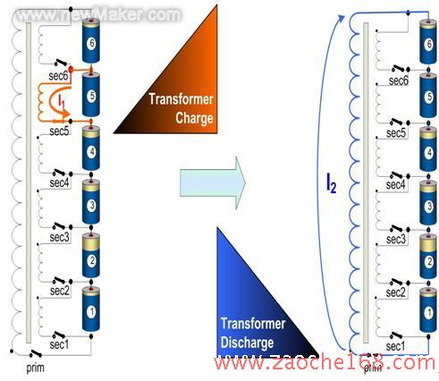 此时闭合主开关(“prim”),电池组开始对变压器充电。主开关断开后,变压器存储的能量就可以转移至选定的电池单元。相应的次级(“sec”)开关——在本例中是开关sec2——闭合后,就开始能量转移。