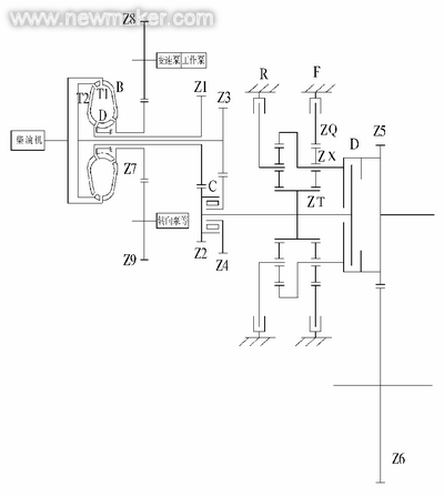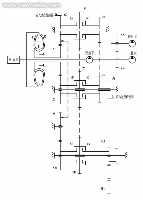 变速器B是一种比较可靠的变速器,图3为ZF 4WG200变速器的传动简图。此变矩器的特点是采用冲焊型一体机芯,结构紧凑,但导轮座上没有挡圈对导向轮进行卡位,因此翻转变速器时有可能使变矩器机芯掉落出来。相对双涡轮变矩器,单涡轮变矩器变矩比要小些(失速变矩器比K0一般小于4,如ZF WG200的K0值为2.55),高效区要窄些(只有单高效区)。