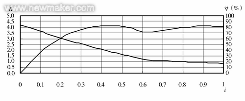 图4为ZF 4WG200变速器的变矩比K和效率η曲线。此变速器的特点是除了输入和输出轴,其它中间轴都是固定不转的;变速泵采用效率较高的内啮合齿轮泵,并且安装在壳体内;材质特殊订制,采用压淬等热处理新工艺,齿轮采用磨齿和齿面强化处理等,关键零件均为进口,加工设备、工装、刀具等比较先进(如壳体采用进口加工中心进行加工),生产环境整洁,装配采取先进的工艺、工装。换挡控制采取电子—液压动力换挡,只需1根电子换挡手柄就能实现换向和换挡操作,并且在换挡手柄端设置有能实现从2挡到1挡的强制换挡KD键。
