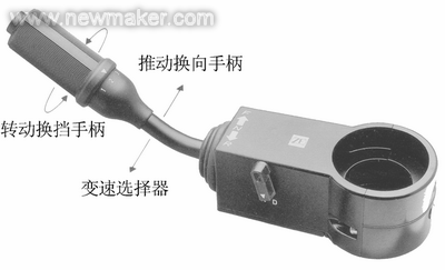 图5为其电子换挡手柄,推动手柄能进行换向操作(并且能空挡锁止以策安全),转动手柄可完成换挡操作。由于变速手柄与变速操纵阀之间是电线连接,因此安装布置非常方便,并且可方便采用可调方向机,使驾驶操纵个性化。由于采用电脑控制换挡装置,因此除了实现4进3退之外,能很容易实现6进3退,扩展了变速器的使用范围。变速操纵阀设有平稳结合阀,使变速器的变速过程平稳、少冲击。但是,影响到此变速器推广普及的最大障碍是:1)售价高。因结构紧凑,要求好的材质和热处理工艺;因精度要求高,需要先进的设备和制造工艺,制约产量的提升。2)配件市场投放量难以与变速器A相比,且价格高,有相当数量的配件需进口。3)维修需专门工具和场地,不能和变速器A一样就地维修,这就会增加维修成本和可能影响工程进度。4)维修保养要比变速器A严格得多。