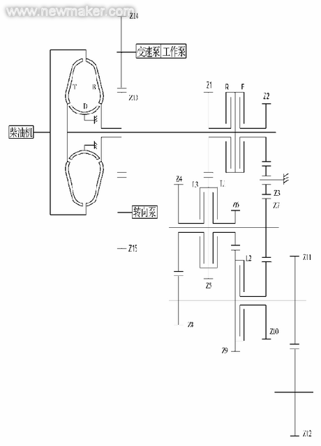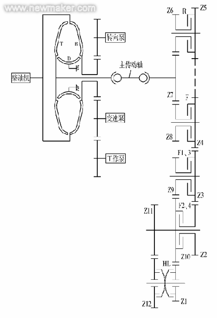 占主导地位的变速器是:双涡轮4元件变矩器+2进1退行星式变速器(为了说明方便,称为变速器A)。高档装载机中主要是采用德国ZF公司(进口或柳州合资生产)的变速器:单涡轮3元件变矩器+4进3退定轴式变速器(为了说明方便,称为变速器B)。部分装载机厂家或部分产品采用的国产变速器:单涡轮3元件变矩器+4进4退,4进2退或3进3退定轴式变速器(为了说明方便,称为变速器C)。国产装载机主要采用以上3种变速器。