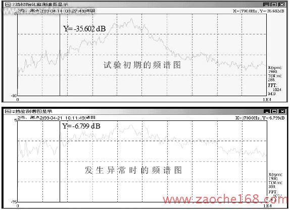 经过60h 试验后,通过故障诊断系统的计算机显示,在第二通道发出警告信息,进行频谱分析,发现谱图显示的能量增加(对比于试验初期时的能量),对比图形见图4。初步判定为一轴轴承发生故障,及时停机进行变速器拆检,果然为一轴轴承由于安装不当造成偏磨,从而引起内圈磨损。及时更换该轴承,保证试验顺利进行。