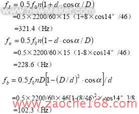 轴承滚道节距 D=46mm,滚动体直径d=8mm,接触角α=14°,滚动体数目n=15.