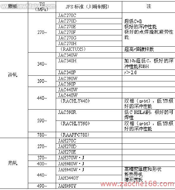 表1和表2分别列出日本JIS标准的冷轧带钢和热轧带钢,强度从270MPa到1180MPa。大体上说汽车内外板用钢有如下几种:(1)普通低碳铝镇静钢;(2)以Nb、Ti为碳氮化物形成元素的细化晶粒钢和沉淀强化钢;(3)铁素体基上弥散分布的马氏体复相组织强化的双相钢;(4)利用残余奥氏体产生高延性的TRIP钢(相变诱导);(5)Nb、Ti固定超低碳(C<20ppm)的IF钢,是具有高r值的强化型IF钢。