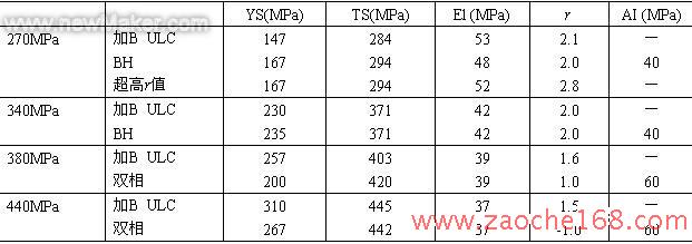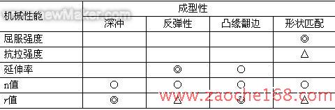 钢材成型性方式大致分为深冲、卷边、形状匹配以及压延性等,每种成型性都有其相应的特性要求,它们与屈服强度,抗拉强度,延伸率, n值,r值的密切相关,如r值对深冲,卷边性有效,屈服强度对形状匹配特别有效。各种成型性和材料特性的关系如表4。