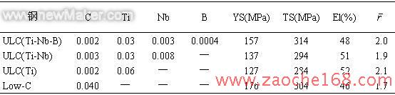 用以往的方法生产的用于深冲成形的冷轧板,r值最高达到2.4。调整成分的Ti-Nb复合IF钢冷轧退火后{111}再结晶织构组织发达,r值达到3.0。其生产工艺要点是在γ区下部温度初轧,在α区上部温度精轧,为防止垂直板面方向的不均匀变形,热轧时加强润滑,这样热轧母板的再结晶{111}织构组织发达。