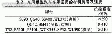 汽车车厢零件形状不太复杂,大都采用辊压成形工艺,对材料的成形性、刚性、耐腐蚀性和焊接性都有一定的要求。一般选用成形性能和焊接性较好的高强度钢板。通常,采用强度级别为300-600 MPa高强度钢板和超细晶粒钢。东风重型汽车车厢常用的材料牌号及强度要求如表2