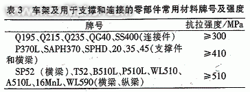 车架、车厢中板及一些用于支撑和连接的零部件,都是重要的承载件,大都采用模具成形工艺,要求材料有较高的强度和较好的塑性,以及疲劳耐久性、碰撞能量吸收能力和焊接性等。一般选用成形性能较好的高强度钢板、超细晶粒钢板(强度级别在300-610 MPa)和超高强度板(强度级别在610-1000 MPa)。东风重型汽车车架及一些用于支撑和连接的零部件常用的材料牌号及强度要求如表3。