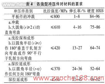 冲压件的结构类型不同,对材料的力学性能要求是不同的,如表4。在选择冲压材料时,首先根据冲压件类型和使用特点,来选择具有不同力学性能的金属材料,以达到既能保证产品质量,又能节约材料的目的。