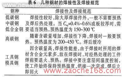 金属材料的焊接性主要决定于化学成分,也决定于焊接工艺条件及结构的刚性。不同的焊接工艺对材料的性能及焊接规范有不同的要求。因此,对于需要进行焊接加工的冲压件选材时,应考虑材料的焊接性。表6列出了几种钢材的焊接性及焊接规范。