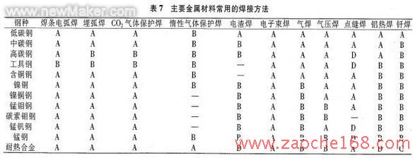 表7列出了主要金属材料常用的焊接方法,供产品设计及工艺人员选择时参考。