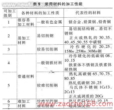汽车冲压件中有少部分零件在冲压成形以后还需要进行机械加工,如传动轴上的储油筒座、底盘.用的制动盘以及发动机上、用一些部件等,因此对这些零件选材时应考虑机械加工对材料的要求。表8列出了常用材料的加工性能。