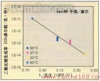 结果显示处于50℃以上的带束层化合物活化能量为100千焦/摩。这一活化能量将被视为处于预期氧化范围(90~100焦耳/摩)。在50℃以下时,结果会与阿列纽斯类型分析所预期的线性数据有偏差。再以同样的测量方式测量二氧化碳和一氧化碳的生成量。二氧化碳和一氧化碳的生成速度分别见(图3)和(图4)。