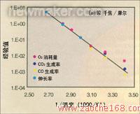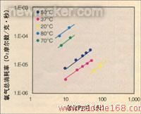 阿列纽斯类型分析显示二氧化碳和一氧化碳的生成速度数据呈线性。它们的活化能量分别为88千焦/摩和96千焦/摩。对同样的样本重复超感氧气消耗测量,可得到每个温度下总的氧气消耗量(见图5)。