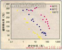 温度为50℃以上,活化能量为100千焦/摩时,转换因素为线性。需要注意的是,高温(50℃以上)氧化动力显示了预期的动力和机理(活化能量)趋势。然而,在50℃以下,动力不同于预期趋势;其氧化明显快于阿列纽斯类型分析的预期。另外可显示带有时间温度叠加的超灵敏氧气消耗方式已经生成环境温度范围内必要的转换因素,以预测环境温度下物理特性衰退程度。因此,下一步就是要测量不同温度下的破坏伸长,得出衰退总曲线,然后转化为所需环境(使用)温度下的情况。