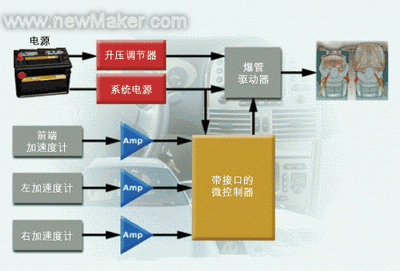 即使是小型的汽车目前都设有6个气囊,而且所采用的安全标准要求极高。负责为气囊充气的是一款称为爆管驱动器(squib driver)的特别芯片,该芯片必须能够在撞车的紧急关头立即启动。按照图2所示,气囊系统由多个部分组成。