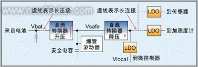 以下简单介绍气囊系统的充气过程。气囊系统设有升压转换器,一般来说,这些升压转换器都采用 sepic拓扑(sepic拓扑要求电路中采用两个电感) 或回扫拓扑结构(回扫拓扑中需要采用一个变压器)。进行充气之前,气囊系统的升压转换器会先将电池电压(Vbat)提高(这个电池电压在负载突降时可高达 40伏),直至达到安全电压(Vsafe)要求的电平,这样可确保安全电容器储存大量电能(见图3)。之后才将这个较高的安全电压调低至几伏,这个较低的电压称为远程电压(Vremote)。必须严格按照这个充气准备程序,以确保其后几级的低压降稳压器出现较少压降。压降越少,功耗也就越低,效率也就越高。