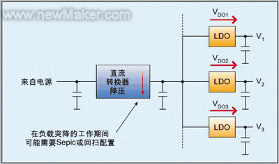 我们若采用开关稳压器作为输入级,再以多个低压降稳压器提供输出,便可降低电源系统的整体成本。高功率的电源系统甚至必须采用这样的设计。图4是其中一个示例。