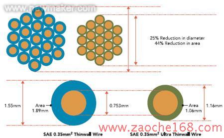 更薄的PPO保护层还使电线的直径减少约25%,对于成捆的电线,直径的减少量将会更大。穿过仪表盘的电线束的横截面积可减少约40%,这是因为“更细的电线可以更好的互相嵌套”,Monroe如是说。更薄的保护层可使线路重量减轻约10%,由于目前汽车线路的总重量一般为100磅左右,这表明它可使总线路的重量减轻至少10磅。