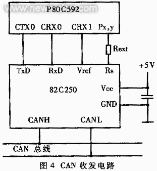 CAN总线收发器82C250是CAN控制器和物理总线间的接口,最初为汽车高速通信设计,具许多针对车辆应用设计的结构。其特点包括:有效减小汽车环境瞬间干扰对信号的影响,具有保护总线能力;防护电池与地之间发生短路;支持低电流待机方式等,因此十分适合电动车辅助逆变电源的需要。将82C250与P80C592的CAN接口输入、输出端相连,便构成了辅助逆变电源对外通讯的接口,如图4所示。