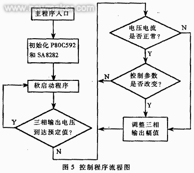 系统上电运行后,单片机P80C952首先对SA8282芯片初始化寄存器进行数据初始化,然后根据负载电机的特点执行软启动程序。当三相输出电压达到预定值时,三相逆变电源即进入稳定运行状态。此后控制程序将循环检测各线路的电压、电流情况,根据情况修改SA8282控制寄存器参数,调整PWM输出,从而改变三相输出。例如,电动车运行一段时间后,电池组电压下降,导致逆变电源的三相输出电压低于设定值,P80C592检测到该现象后,通过SA8282提高电压输出幅值,确保电源输出的稳定。