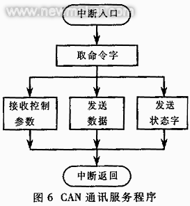 CAN总线通讯程序包含若干子程序,其基本程序结构如图6所示。当通讯程序触发后,P80C592的CAN控制器提据命令字执行相关任务。当上位机请求数据时,将逆变电源的各项运行参数传输给整车系统;当上位机查询节点状态时,将当前CAN节点状态等数据发磅出去;当上位机要求修改运行参数时,将接收的数据参数存入数据存储器。