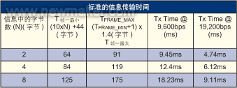 下表介绍了2、4、8字节信息在传输速率为600bit/sec 和19200bit/sec时的最长持续时间。本协议专用于1kbps和 20kbps之间的运行,建议在LIN技术规范中也使用这些传输速率。如表1所示。
