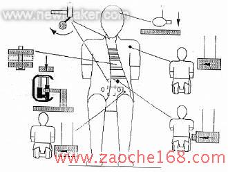 我们对试验室原有的Hybrid III 型假人标定试验台进行了改进,使之能够进行侧撞假人各部位的标定。原有的胸部标定试验台增加了对肩部、腹部和骨盆的标定功能,颈椎试验台改进后也可用于对腰椎的标定。