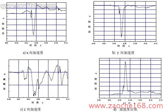 图11 是车载数据采集系统采集到的假人头部加速度信号及合成,结合图像运动分析可以看出,头部加速度峰值出现在碰撞后53ms,是由假人头部后侧面与B 立柱撞击产生的。本次试验假人头部HIC 值计算结果为700左右,其他部位伤害指标也都满足侧撞法规要求。