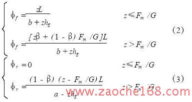 式中φf、φr为前、后轴利用附着系数;z为制动强度;a、b、hg分别为车辆质心与前后轴的距离和质心高度;L为轴距;G为整车质量;β为前后液压制动力分配比;Fm为电机产生的前轴再生制动力。