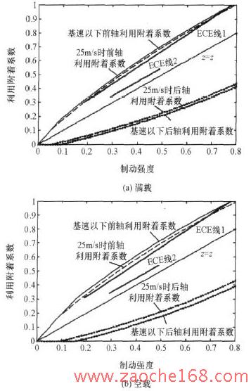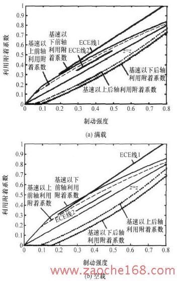 从图5可以看出,优化后的整个工作区间绝大部分符合ECE控制要求,制动效率较高。在空载、制动强度0.2~0.3时,基速以下制动时部分前轴利用附着系数曲线超出了范围,这是由于低速电机制动力过高引起的,此时单独依靠优化前后制动力分配不能解决此问题,需要对车辆质心的位置在整车设计时进行优化。