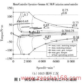 工况分析是获得电动汽车动力及能量需求的常用方法,通过工况分析不但可以确定系统的动态特性,而且有助于分析电动汽车行驶中的对驱动电机的转矩和转速需求,进而得到该工况下电动机工作特点。以典型循环工况为例,分析电动汽车制动时的电机工作区域特点。图1为两种典型城市循环路况对应的电动汽车驱动电机的工作区域图,图中的每个“ ×”点对应一个实际工作点(时间间隔为秒) 。由图可知城市路况的制动相当频繁,且相对于电机的电动区而言,制动区工作点集中在较低的转矩下,即电机常处于较轻强度的制动状态下。