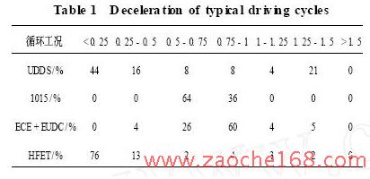 在制动区的工作点多少决定了各种典型循环工况的制动能量所占的比例。常见的典型循环工况制动能量的比例UDDS为25%, 1015为2517% , ECE第3期电动汽车用高效回馈制动控制策略325+ EUDC为18%, HFET较小,为6%。表1给出了四种典型路况不同制动强度(分为减速度< 0125、0125~015、015~0175、0175~1、1. ~1125、1125 ~115以及> 115的7个区间,单位是m / s2 )所占的百分比,几乎均处于可以采用再生制动的制动强度范围内。