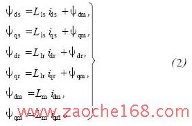 其中: Rs、Rr、Rfe为定、转子及铁损等效电阻; Lls、Llr为定、转子漏感; Lm 为励磁电感; np 为电机极对数;Uds、Uqs、Udr、Uqr和ids、iqs、idr、iqr分别为定、转子d、q轴电压(对于鼠笼机, Udr =Uqr = 0)和电流; idfe、iqfe、idm、iqm分别为d、q轴铁损等效绕组、励磁电流;ω1、ωs、ωr 分别为电机同步、转差、转子角频率;ψds、ψqs、ψdr、ψqr、ψdm、ψqm分别为d、q轴定、转子及主磁链; Te为电磁转矩。