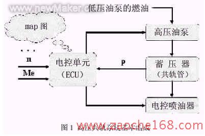 共轨技术是指高压油泵、压力传感器和ECU组成的闭环系统中,将喷射压力的产生和喷射过程彼此完全分开的一种供油方式,由高压油泵把高压燃油输送到公共供油管,通过对公共供油管内的油压实现精确控制,使高压油管压力大小与发动机的转速无关,可以大幅度减小柴油机供油压力随发动机转速的变化,因此也就减少了传统柴油机的缺陷。ECU控制喷油器的喷油量,喷油量大小取决于燃油轨(公共供油管)压力和电磁阀开启时间的长短。