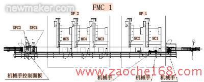 每个FMC中都由几道工序组成,每道工序分别由多台相同型号的加工中心组成。每个FMC前面是上料辊道,后面是下料辊道及检测站。各个FMC之间也是相应的辊道,可以起到工件暂存作用。