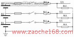 对多个蓄电池串联的电压测量方法主要有变阻分压,继电器开关切换,分布式电压测量3种方案。本设计的检测对象是4组并联、每组为40节串联的末端电压为48V的电池组,其单节电池标称电压为1.2V,主要用来检测电池状态,避免其中的单节坏电池影响使用,要求的精确度不是很高。所以,每个测压模块测量一组电池,即以每8节电池为一单元进行测量。考虑到工艺及成本,测压电路采用变阻分压与继电器开关相结合的电路结构。