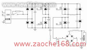 该模块(见图4)是实际设计中的难点,它与外电网相连,对车载电池进行充电,并能根据控制电路发出的指令或标志位,实现对蓄电池分阶段、以不同电流进行充电,且有自动断电的功能,实现智能充电。根据实际需要的大功率、高电压的特点,其主电路采用全桥拓扑结构,输出回路采用全桥整流,同时,为改善功率开关器件的工作状态,主电路采用了软开关技术。