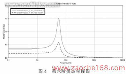 图4 为车辆模型第六阶模态坐标图,从图中可以看出外界输入频率为5.5Hz 时系统的垂直振动幅度最大,此时车辆乘坐舒适性最差。