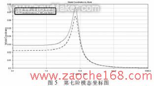 图5 第七阶模态坐标图,从图中可以看出,当外界输入频率为7.1Hz 时,车辆发生侧翻运动的可能性最大。