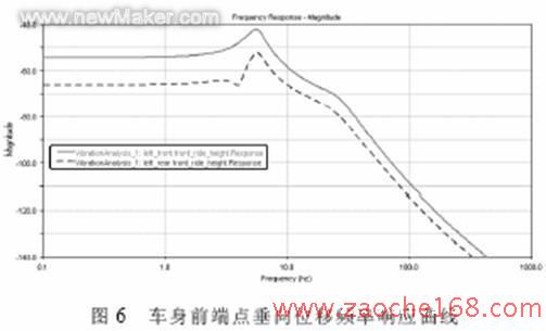 在测试频率范围内系统共有11 阶模态,通过软件提供的动画功能可以很清楚的看出系统的第六阶模态和第七阶模态对车辆的振动有重要影响,其中第六阶模态主要影响车辆的垂直振动,而第七阶模态则对车辆的侧倾运动有较大影响。另外,通过分析频率响应曲线,可以发现车辆左前轮与右前轮处输入激励、左后轮与右后轮处输入激励对各输出参数的影响往往相同,这样的结果要归结于车辆模型的对称性。以下在分析各输出参数时,只考虑左前轮与左后轮处输入激励的影响。