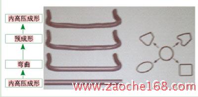 一些汽车零件是先用钢板冲压成两个半片,然后焊接在一起,形成中空的管状结构件。由于焊接而成,工序复杂,强度和刚度均不理想。德国Thyssen-Krupp长期致力于发展液压管成形技术,通过焊接钢管技术、管件液压成形技术、管件激光拼焊技术和卷管技术等系列关键技术的开发,已经形成成套技术,并已经开发出概念车。通过液压管成形技术的应用,可以改善零件的受力条件,提高构件的承载能力,降低车体重量20%~30%,成本稍稍高于传统车,目前已经在众多车辆上推广应用。汽车零件内高压成型技术见图5。国内目前哈尔滨工业大学在液压管成型方面具有较高研究水平。