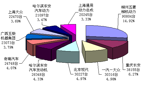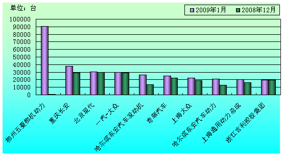 2009年1月份,汽油发动机企业总销量为505522台,环比增长31.62%。与12月份相比,柳州五菱柳机动力(90804台),环比增长13978.14%,重庆长安(38155台),环比增长31.02%,北京现代(30227台),环比增长2.53%,一汽-大众(29722台),环比增长1.31%,哈尔滨东安汽车发动机(26348台),环比增长97.20%,奇瑞汽车(24748台),环比增长12.22%,上海大众(22470台),环比增长17.69%,哈尔滨东安汽车动力(21097台),环比增长65.94%,上海通用动力总成(20245台),环比增长27.30%,柳州五菱柳机动力以90804台夺得本月的冠军,而2008年12月份柳州五菱柳机动力汽油机才销售了645台,重庆长安汽车、哈尔滨东安汽车发动机、哈尔滨东安汽车动力和上海通用动力总成,这4企业在1月份的表现也相当不错,增长率分别达到了31.02%、97.20%、65.94%和27.30%;在1月份只有浙江吉利控股集团微弱下滑,销售发动机(19678台),环比下降0.24%;前10家汽油发动机企业总销量为323494台,占2009年1月份汽油发动机总销量的63.99%的市场份额。