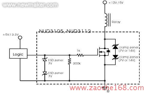 40VN-沟道FET用于转换继电器线圈中高达500mA的电流。箝位保护齐纳二极管(14V)提供箝位功能,以抑制在线圈断开时(V=Ldi/dt)产生的电压尖峰。ESD保护齐纳二极管保护门-源硅结,防止其在器件传递或组装过程中可能由人体感应引起的ESD造成损坏。偏置电阻为FET提供驱动控制信号。图3描述了NUD3105/NUD3112器件的典型连接图。