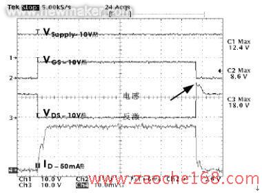 当正向逻辑电压施加到器件的门极时(5V/3.3V),FET导通,启动继电器。当FET截止时,继电器线圈停止,使它反激并产生一个高电压尖峰,这个电压尖峰被接在FET上的箝位齐纳二极管所抑制。这个工作序列在继电器驱动器的所有开和关的操作中重复。图4显示了NUD3112继电器驱动器控制OMRON继电器(G8TB-1A-64)时产生的电压和电流波形。此继电器线圈有以下特性:L=46mH,Rdc=100Ω。继电器从12V电源电压所吸收的电流是120mA。集成FET典型的导通电阻是1Ω,因此在25℃的环境温度时,FET上产生的功耗大约为15mW(P=I2R)。其结果是导通压降只有125mV,电流为120mA。