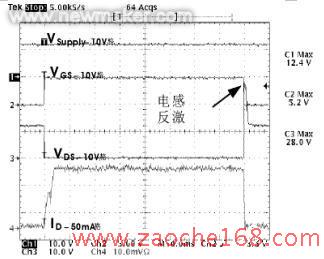 图10显示的示波图为在负荷突降瞬变时在NUD3124器件上产生的波形。对于这种情况,器件控制一个线圈特性为L=48mH和Rdc=100Ω的OMRON继电器(G8TB-1A-64)。流过驱动器的电流很小(大约为170mA),因为它被继电器线圈的电阻(100Ω)所限制。导致的能量大约为73mJ,这依然在NUD3124器件的雪崩能量容量(350mJ)以内。在某些情况中,负荷突降瞬变甚至高达80V,但是NUD3124器件的可靠性也可以处理那些类型的负荷突降状况。