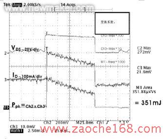 与NUD3105和NUD3112器件(工业版本)不同,NUD3124器件(汽车版本)的独特设计提供了有源箝位特性,通过在任何瞬间电压情况超过箝位齐纳二极管击穿电压(28V)的时候触发FET,允许更高的反向雪崩能量容量。NUD3124器件的能量容量一般为350mJ。图8显示了施加到器件上的浪涌测试示波器图,由它可以测出最大的反向雪崩能量容量。