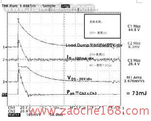 图9中所示的73V波形来自60V的负荷突降瞬变加上汽车的电池电压(13V)。在应用领域内,继电器驱动器(NUD3124)总是连接到继电器,因此如果负荷突降情况发生,电流被继电器线圈电阻限制,这减少了需要由继电器驱动器(NUD3124)排放到地的能量。