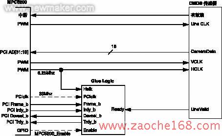 ---图2是MPC5200与接口芯片和CMOS传感器的连接图,显示了连接到必需的接口逻辑或直接连接到传感器的MPC520 PCI信号。图2中的粗线表示三态的情形。总线需要外部上拉电阻,这样在其输入值中,接口逻辑就会出现一个逻辑数字“1”。