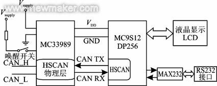 汽车内部CAN网络主要由两部分组成:面向底层ECU的CAN节点和实现高低速网络数据共享及网络管理的网关。为了减少开发周期,选择Motorola公司一款带CAN模块的中档微处理器MC9S12DP256;CAN收发器以及电源系统是用MC33989来实现的。